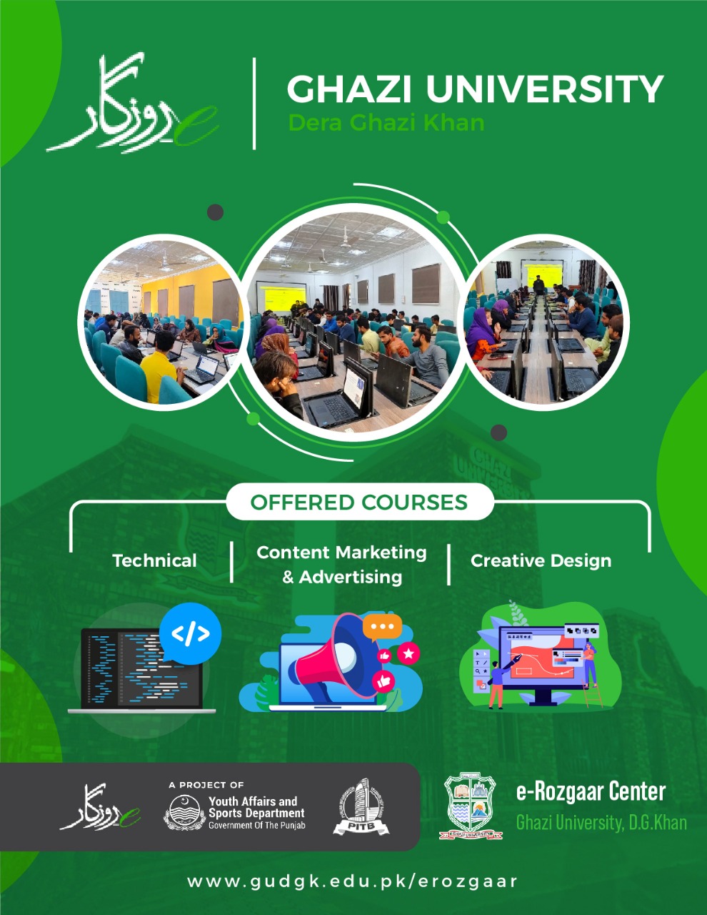 "In the backdrop of soaring unemployment and financial challenges it became a paramount duty of the government to steer the educated youth of the province in the right direction. Hence, Punjab Information Technology Board, Youth Affairs and Sports Department and Ghazi University, Dera Ghazi Khan decided to establish e-Rozgaar center in Ghazi University to provide training to budding freelancers and enhance their professional capabilities. One of the major objectives of this project is to provide training opportunities to youth for self-employment using internet based freelancing"