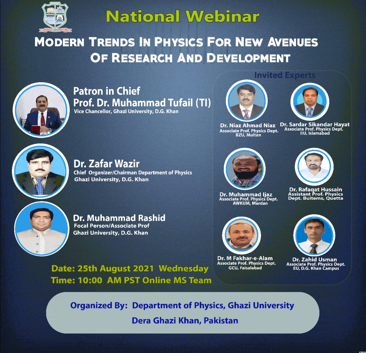 The purpose of the national webinar is to provide a platform that would enable scientists, teachers, researchers and students to interact and share ideas, thoughts and scientific findings in all areas of Physics, including Condensed matter and Materials Physics, Laser and Plasma Physics, Nuclear Physics, Computational Physics, High Energy Physics. Physics is increasingly important for broad technological and economic development. It has long been a fertile ground for the development of technology. At the beginning of the 21st century, physics has become more important for the other sciences, enabling progress in materials science, astronomy, chemistry, geology, and the biomedical sciences. Many of the problems in these areas are increasingly becoming physicsdependent problems; that is, the basic laws of physics play an important role in their understanding. New areas in physics are emerging in response to experimental techniques of unprecedented scope and sensitivity as well as the increasing power of computation. We can now control single atoms, observe properties of matter at densities greater than that of the atomic nucleus, design materials with novel properties, study the molecular motors responsible for distributing genetic information during cell division, and probe the earliest moments of the universe. Energy storage devices have found great applications in many portable devices. Hence, the eco-friendly materials replace the conventional acid battery metallic storage devices that require more recharge time, acid utilization and have less abundance. Energy storage devices are systems which store energy in various forms such as electrochemical, kinetic, pressure, potential, electromagnetic, chemical, and thermal; using, for example, fuel cells, batteries, capacitors, flywheels, compressed air, pumped hydro, super magnets, hydrogen, etc. Energy storage devices can play an important role in stand-alone renewable power systems. In systems without generators, they can provide backup power for intermittent renewable power sources. In systems with generators, they can save fuel and help avoid inefficient generator operation by serving the load during times of low electric demand, where the generator is least efficient.