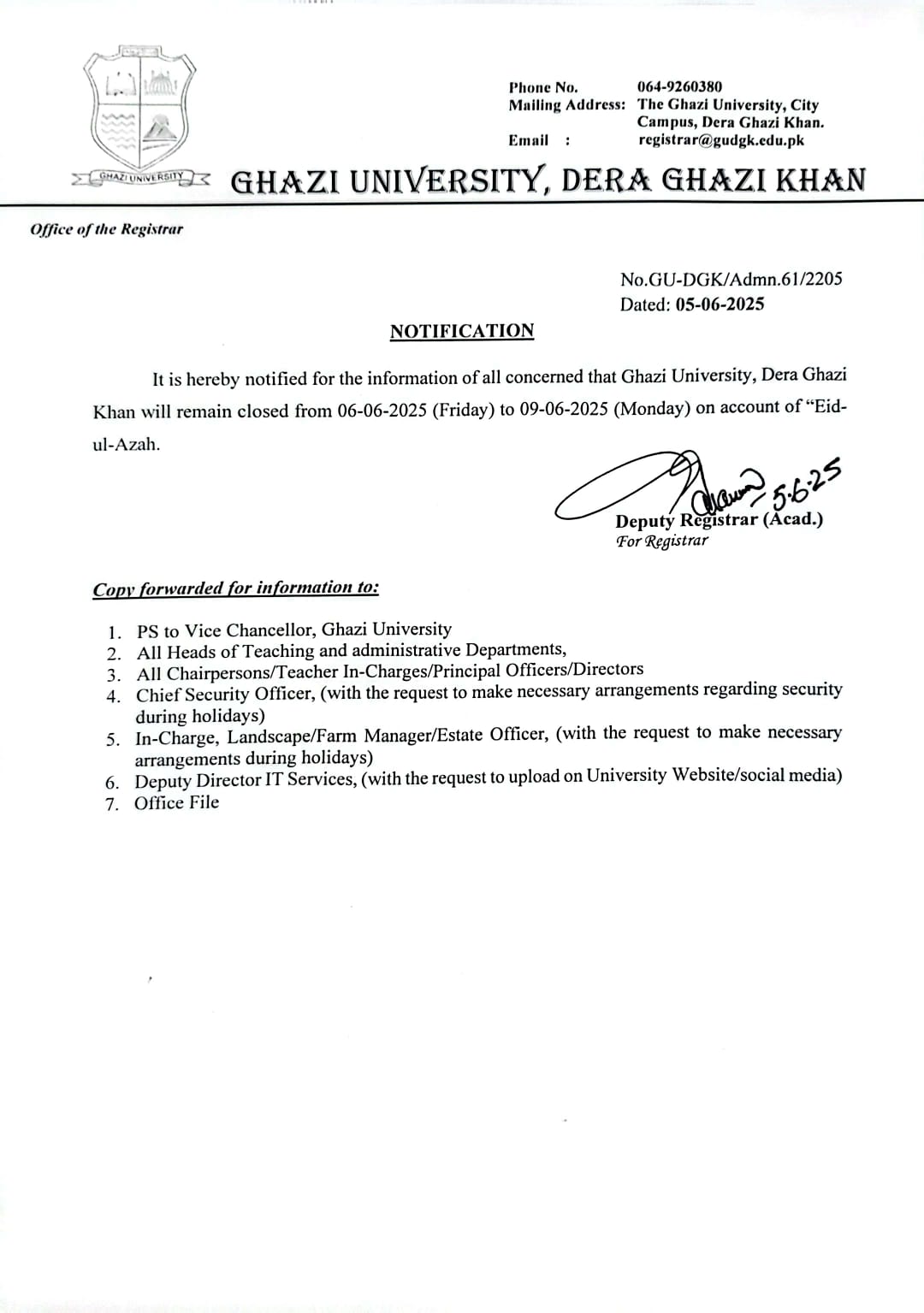 Notification: Eid-Ul-Azah Holiday 2025