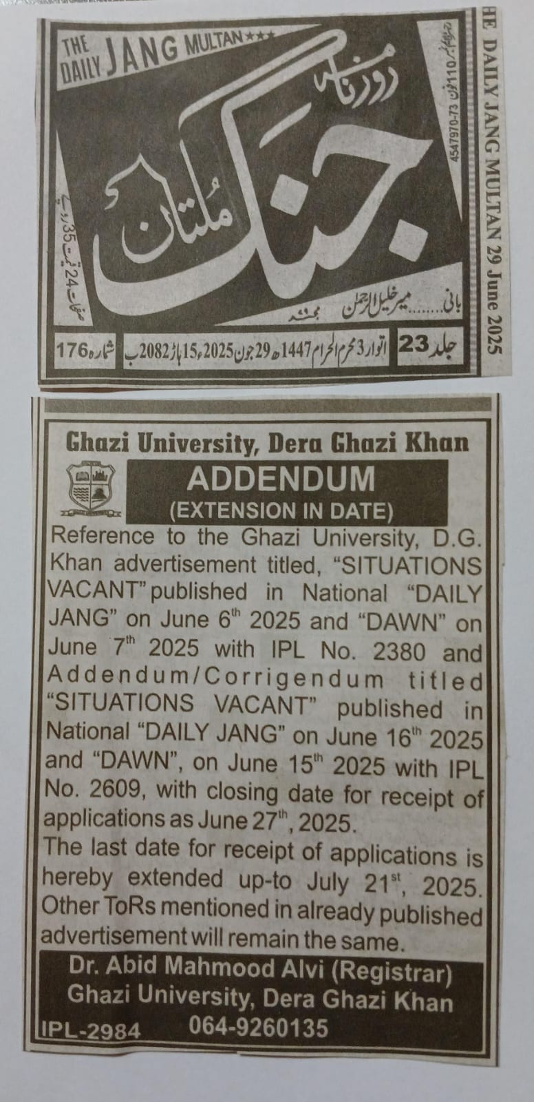 Addendum ( Extension of Date of Situation Vacant)