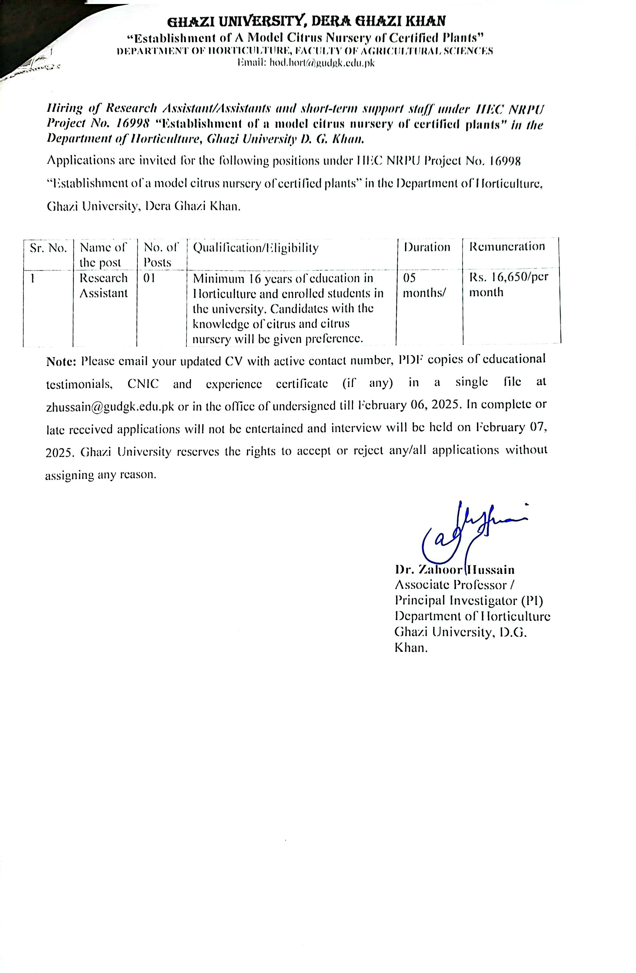 Hiring of Research Assistant/Assistants and short-term Support Staff Under HEC NRPU Project No. 16998 "Establishment of a model citrus nursery of certified plants" in he Department of Horticulture, Ghazi University D.G Khan