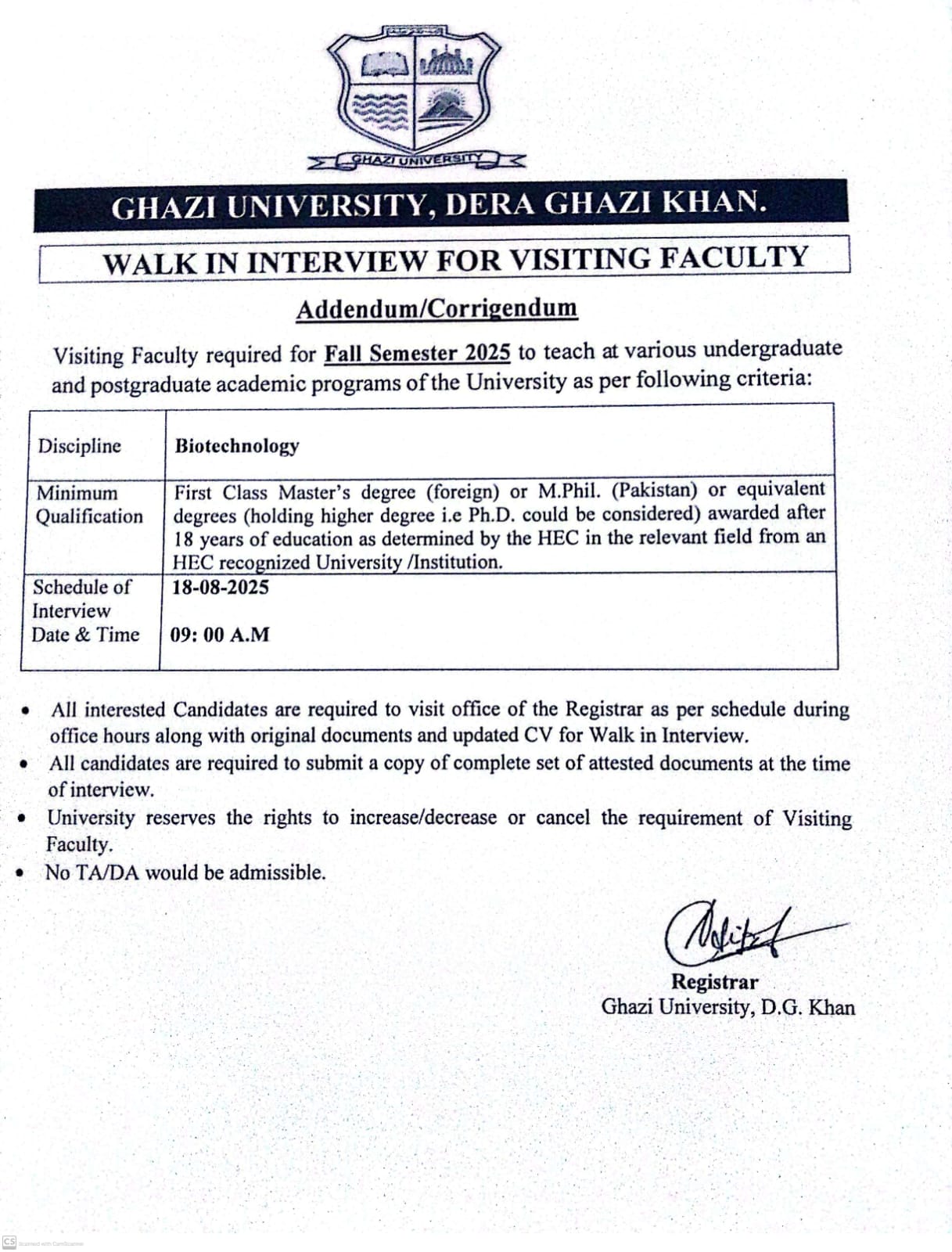Walk In Interview for Visiting Faculty (Addendum/Corrigendum)