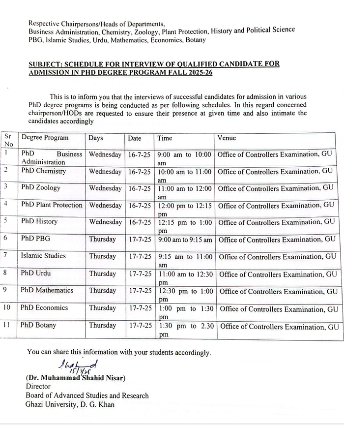Schedule For Interview of Qualified Candidate for Admission in PHD Degree Program Fall 2025-26 Download
