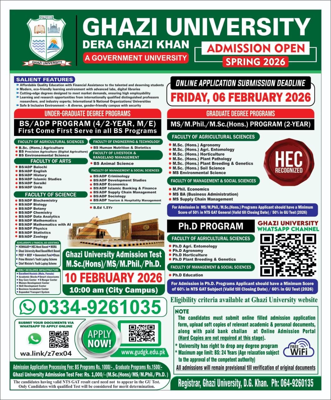 Admissions Open Spring 2026, Ghazi University, Dera Ghazi Khan