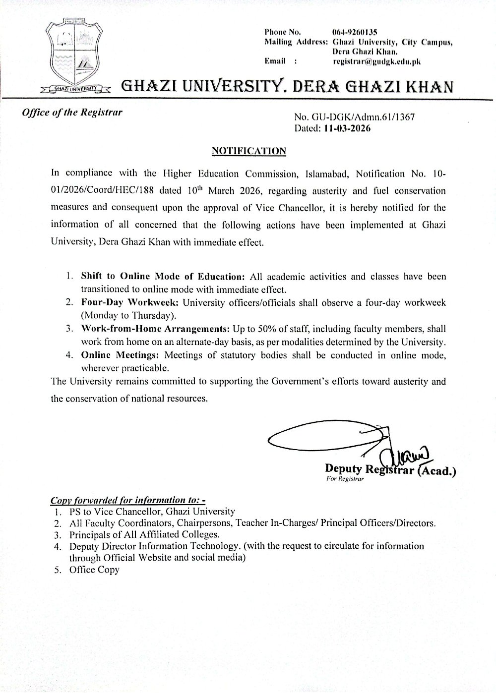 Notification : Regarding austerity and fuel conservation measures