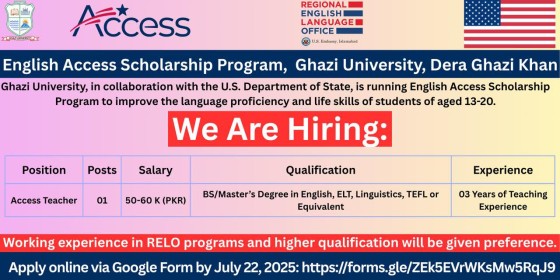 Hiring Access Teacher, English Access Scholarship Program, Ghazi University, Dera Ghazi Khan