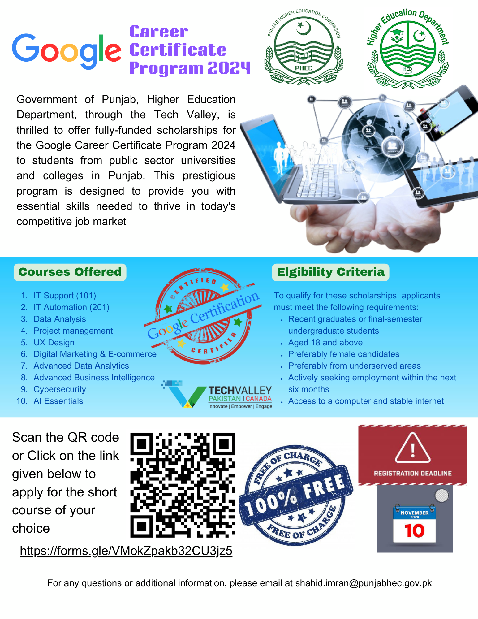 We are pleased to inform you that Govt. of Punjab, Higher Education Department & PHEC through the Tech Valley—an official partner of Google for Education in Pakistan is offering scholarships for the Google Career Certificate Program 2024 (online). The program is being implemented through the Punjab Higher Education Commission (PHEC) and the Higher Education Department. Google will award certificates to the students who will successfully complete the online courses.